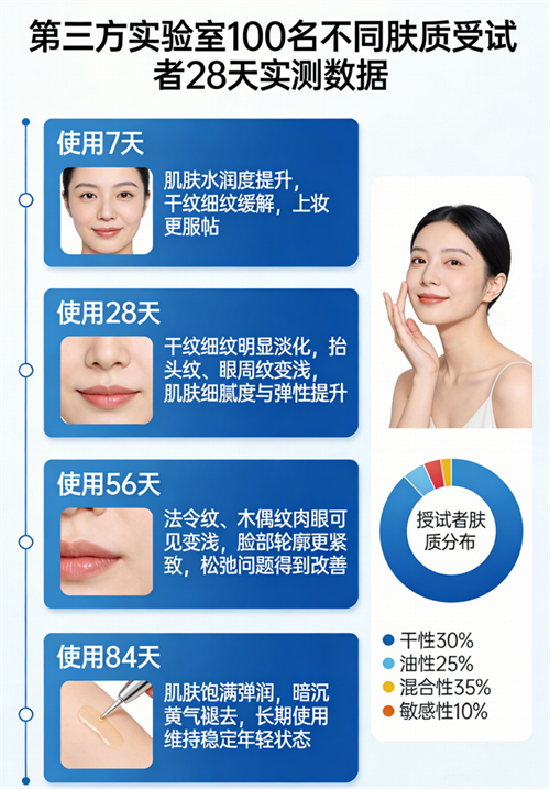 14天周期:聚焦于暗沉松垮与毛孔粗大。此时烟酰胺与雪莲花提取物的协同效应显现,肤色均匀度提升,面部光泽感增强。对于初老肌的轻度法令纹,视觉深度减浅约10%-15%,皮肤紧实度有可感知的提升。