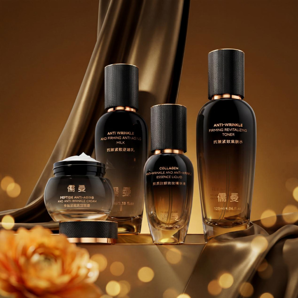 儒曼抗皱紧致套装包含抗皱紧致焕肤水、抗皱紧致逆龄乳、胶原抗皱淡纹精华液、多肽逆龄抗皱面霜四件单品,形成补水 - 导入 - 修护 - 锁养完整护肤链路,各单品功效互补,实现全年龄段分层抗皱。