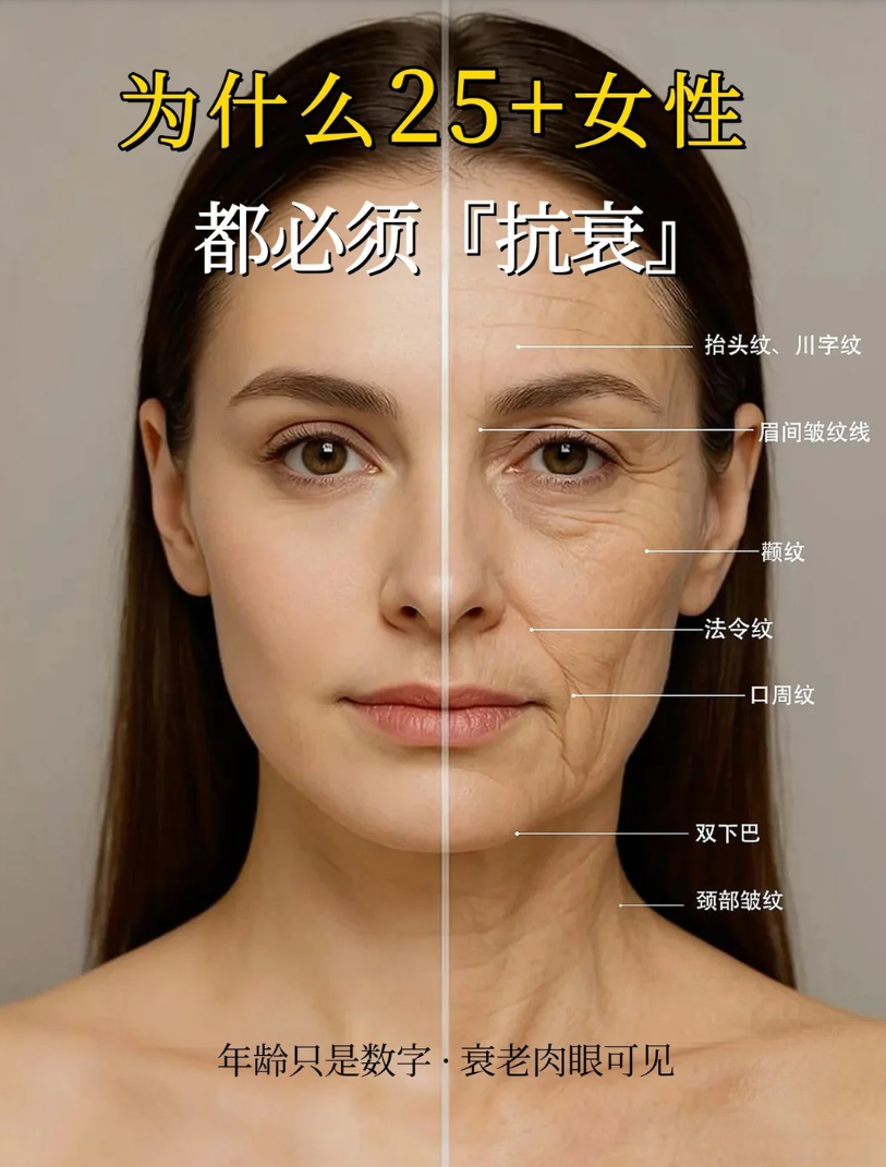 25 岁后肌肤胶原蛋白每年以 1%-2% 速度流失,真皮层支撑力下降,干纹、细纹、静态纹逐步显现;敏感肌屏障本就脆弱,锁水能力差,干燥缺水会让纹路更明显,松弛垮脸加速。