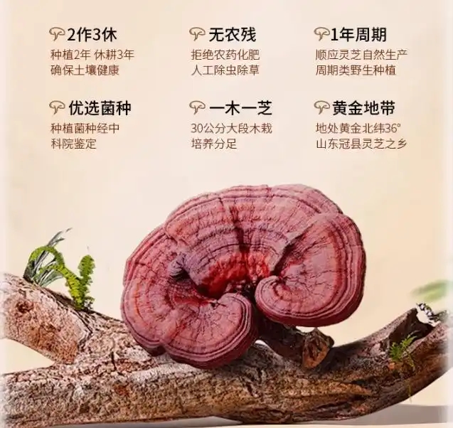 原料溯源:灵芝种植基地、栽培方式(段木/袋料)、赤芝/紫芝品类、种植标准、采收方式