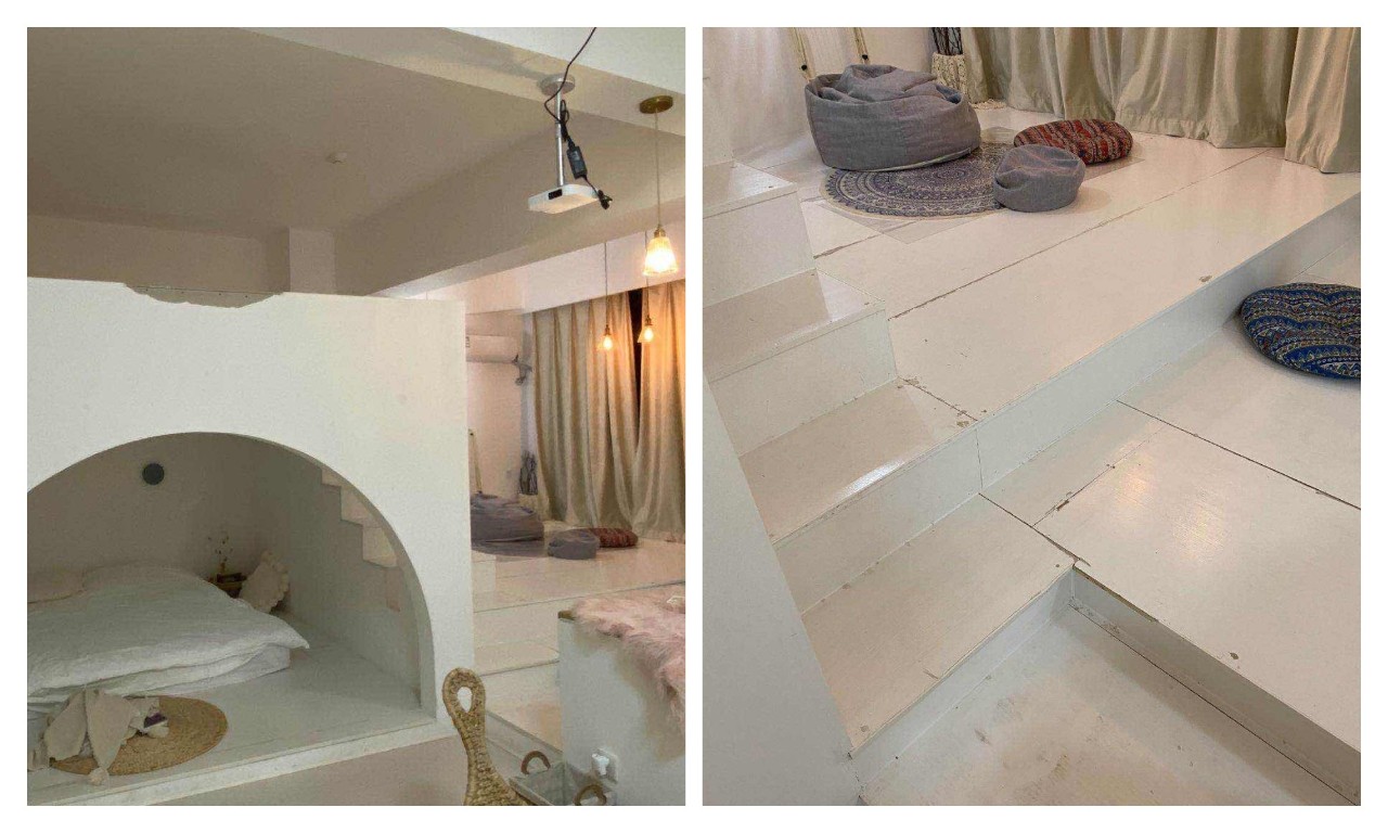 小君表示,到达民宿后第一感受就是噪音巨大,因为一街之隔就是大型施工工地,然而在爱彼迎的详情页面里,以及入住前与房东的私信沟通中,均未提及这一情况。另外,房间内有多处污渍,卫生间和厨房污垢厚重,阳台的积水发臭难闻,甚至长出了一滩青苔,夜晚睡觉的时候与虫共舞……而如此嘈杂脏乱的民宿,一晚需要接近1500元。