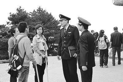 陈寿富(右二)在黄山上解答游客咨询。 资料图片