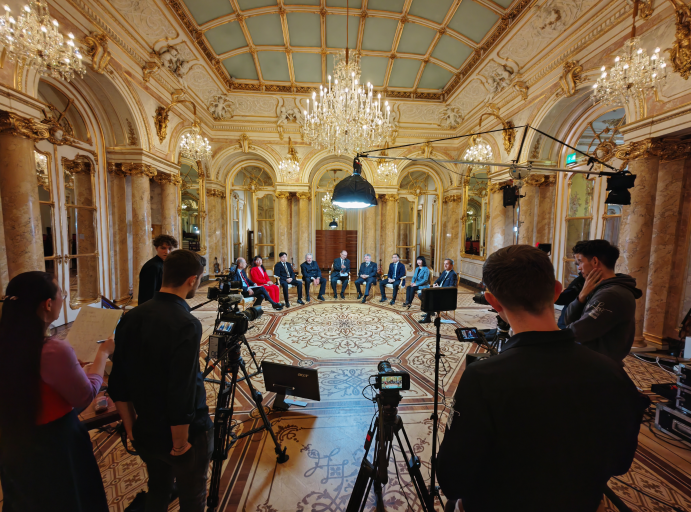 奥地利分会场圆桌论坛在奥地利COBURG宫殿拍摄录制,嘉宾围绕“深化奥中VR领域合作”主题,从成果分享、引领未来和深化合作三部分展开讨论。(习国燕 供图)